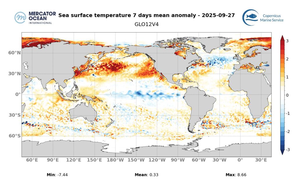 - North Atlantic – In the western area of Norway, the marine heatwave is decreasing in intensity and extent.