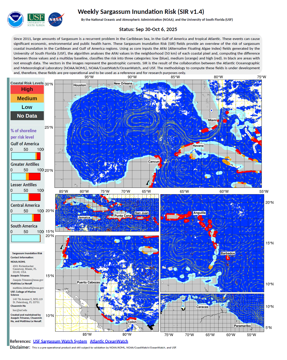 • Experimental Weekly Sargassum Inundation Risk (SIR v1.3) By the National Oceanic and Atmospheric Administration (NOAA), and the University of South Florida (USF) Status: Sep 30-Oct 6, 2025