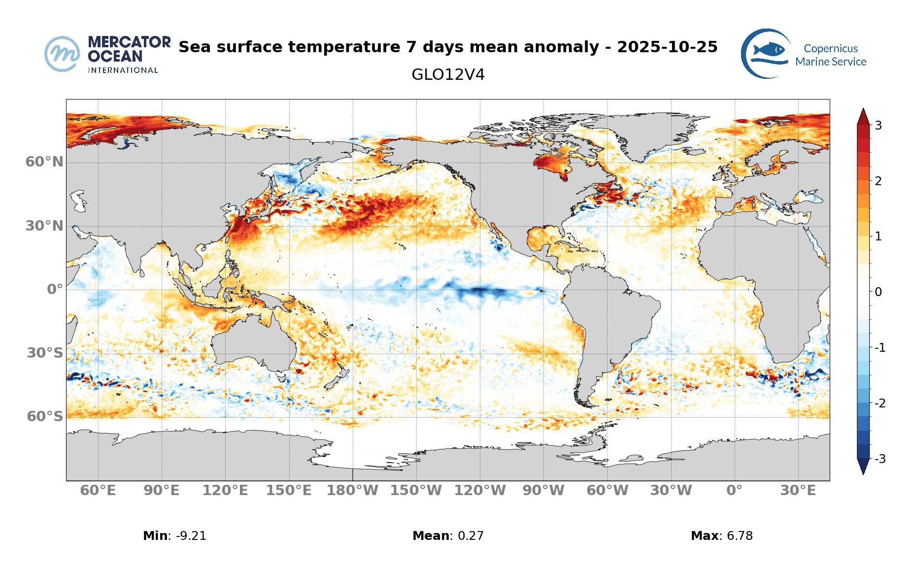 - Tropical Pacific – Philippine Sea and Indonesia regions are seeing an increase in intensity of the local marine heatwave, which remains stable in surface area.