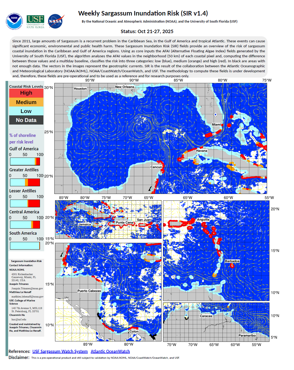 • Experimental Weekly Sargassum Inundation Risk (SIR v1.3) By the National Oceanic and Atmospheric Administration (NOAA), and the University of South Florida (USF) Status: Oct 21-27