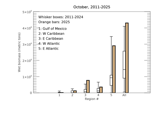The map above shows the average Sargassum abundance for the month of October 2025, with warm colors representing higher abundance. The top color (red) indicates that 0.4% of the ocean surface is covered by Sargassum, meaning that Sargassum clumps and mats are scattered here and there in the location. The Sargassum abundance for each region is compared with historical values in the same month of 2011 – 2024 in the whisker box plot below, where horizontal bars in each vertical box indicate minimum, 25%, 50%, 75%, and maximal historical values, respectively.