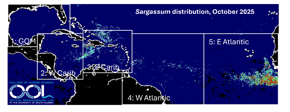 Looking ahead: Total Sargassum amount in all regions is likely to continue to decline, possibly reaching the annual minimum in November. Correspondingly, most regions should be free of massive inundations, as the Sargassum “season” is over. One possible exception is the East Atlantic, where the total Sargassum amount will likely remain relatively high even after further declines in November. All previous monthly bulletins as well as daily imagery can be found under the Sargassum Watch System (SaWS).
