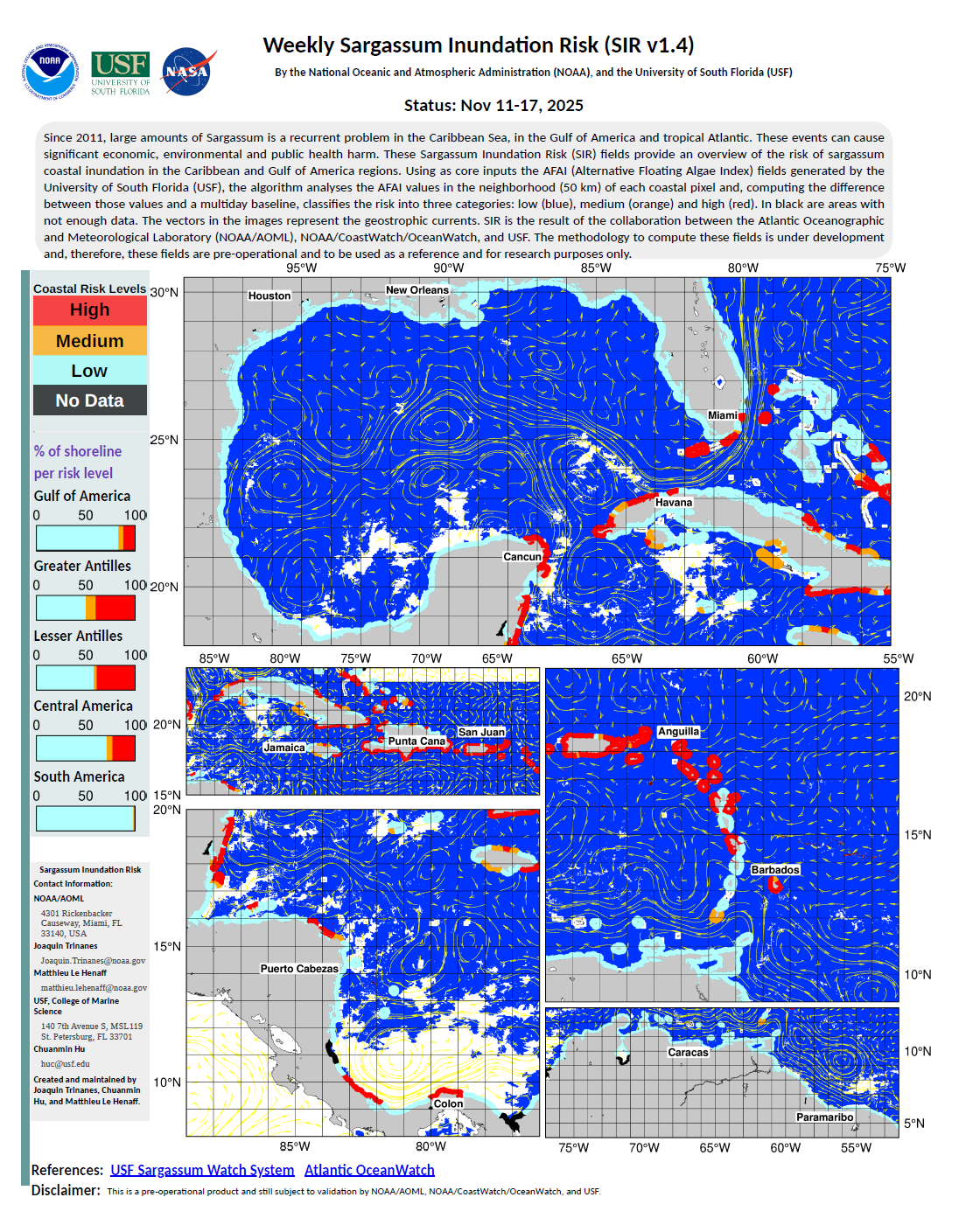 • Experimental Weekly Sargassum Inundation Risk (SIR v1.3) By the National Oceanic and Atmospheric Administration (NOAA), and the University of South Florida (USF) Status: Nov 11-17, 2025