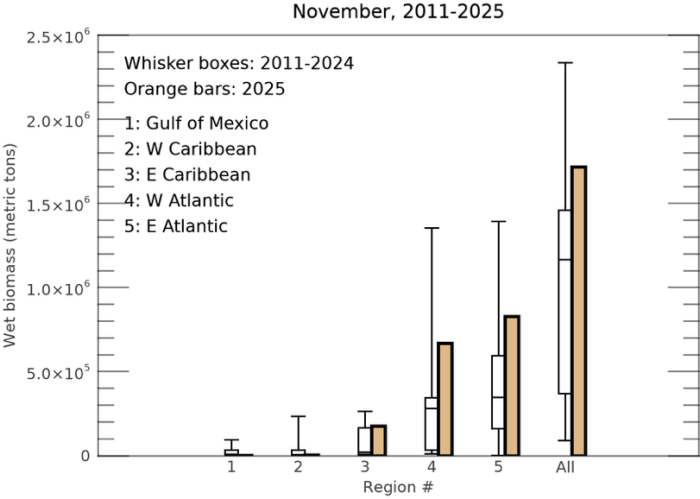 As predicted last month, the total amount of Sargassum in each but the West Atlantic region continued to decline substantially in November, with Sargassum biomass more than halved. Total Sargassum amount for all regions combined decreased from 4.3M metric tons in October to 1.7M metric tons in November. Negligible amount of Sargassum was found in the Gulf of America and western Caribbean, and Sargassum “season” for all Caribbean and Gulf regions is over. Despite such sharp declines, total Sargassum amount in the eastern Caribbean and tropical Atlantic still exceeded 75% of their historical values in November.