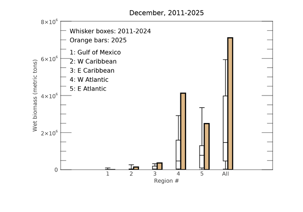 Looking ahead: Although Sargassum amount in the Gulf will remain negligible, Sargassum in the Caribbean will likely continue to grow, leading to beaching events along the Mexican Caribbean coast and some of the Lesser Antilles islands. Some beaching events may already have occurred. Such early beaching events are unusual, but will likely continue in the coming months. Because of the rapid growth from November to December and because of the high Sargassum amount in most regions, 2026 is likely another major Sargassum year (i.e., Sargassum amount exceeds 75% of the historical values).