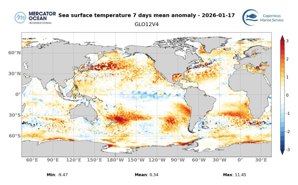 Sea surface temperature mean anomalies for the week 11 to 17 January 2026