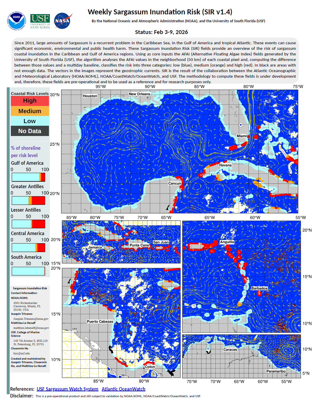 • Experimental Weekly Sargassum Inundation Risk (SIR v1.3) By the National Oceanic and Atmospheric Administration (NOAA), and the University of South Florida (USF) Status: Feb 3-9, 2026