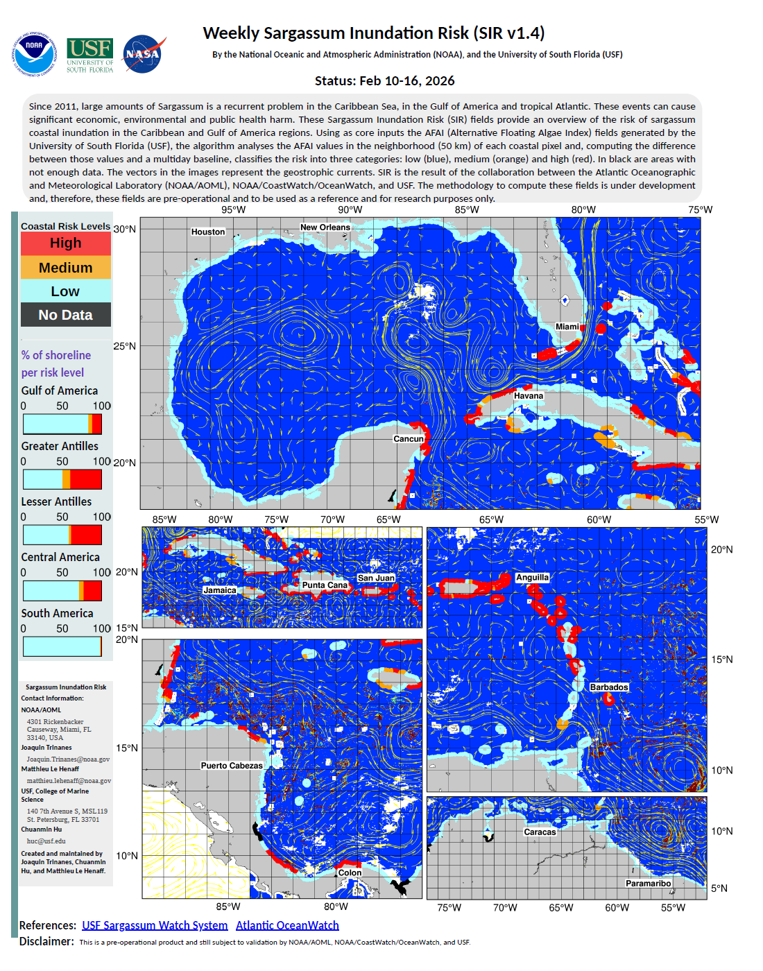 • Experimental Weekly Sargassum Inundation Risk (SIR v1.3) By the National Oceanic and Atmospheric Administration (NOAA), and the University of South Florida (USF) Status: Feb 10-16, 2026