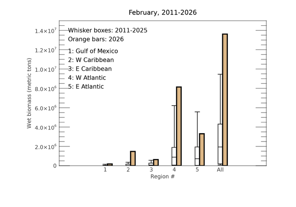 The map above shows the average Sargassum abundance for February 2026, with warm colors representing higher abundance. The highest color (red) indicates that 0.4% of the ocean surface is covered by Sargassum, meaning that clumps and mats are scattered throughout the area. The abundance for each region is compared with historical values for the same month from 2011–2025 in the whisker box plot below. In each vertical box, the horizontal bars represent the minimum, 25th percentile, median (50%), 75th percentile, and maximum historical values.