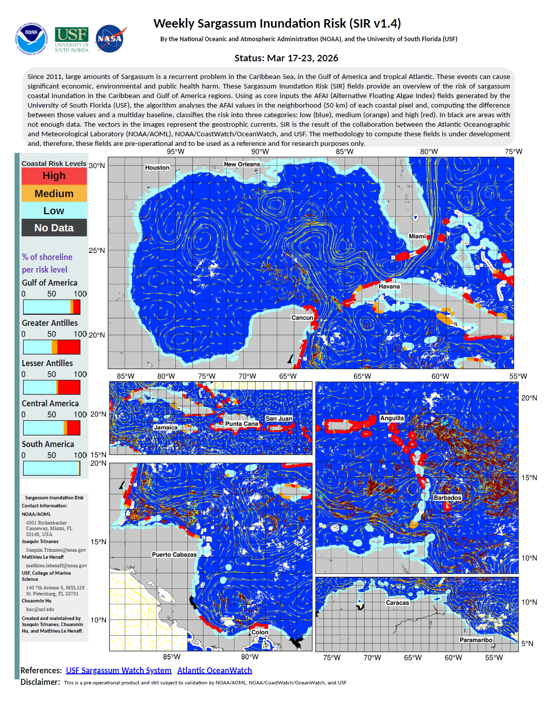 • Experimental Weekly Sargassum Inundation Risk (SIR v1.3) By the National Oceanic and Atmospheric Administration (NOAA), and the University of South Florida (USF) Status: March 17-23, 2026
