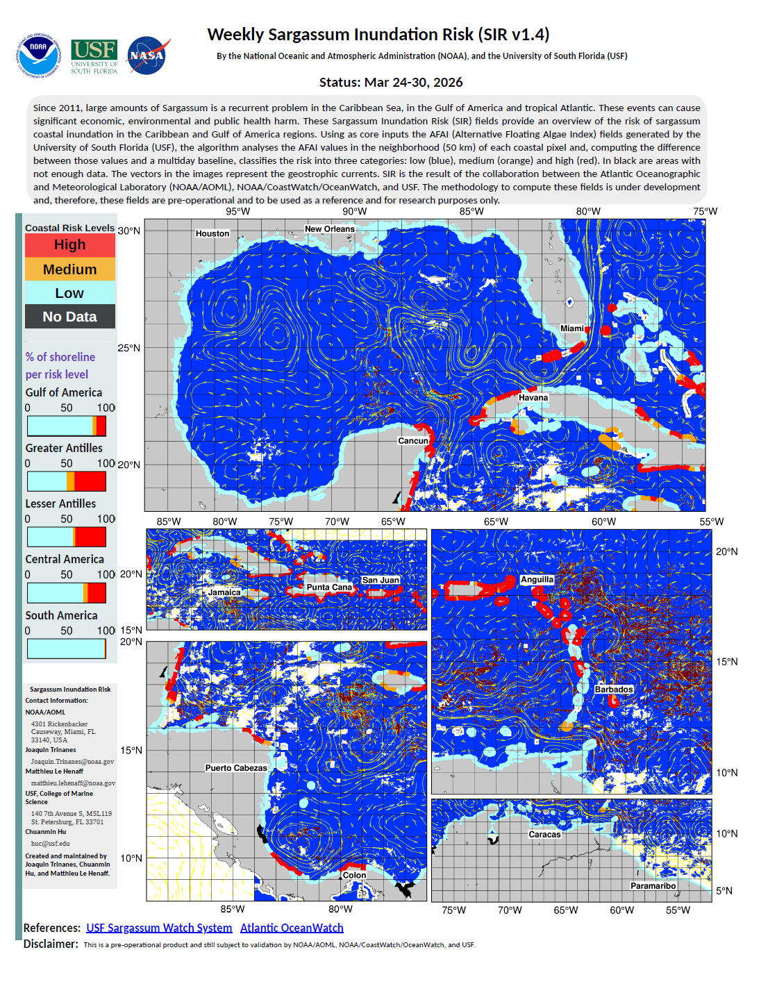 • Experimental Weekly Sargassum Inundation Risk (SIR v1.3) By the National Oceanic and Atmospheric Administration (NOAA), and the University of South Florida (USF) Status: March 24-30, 2026