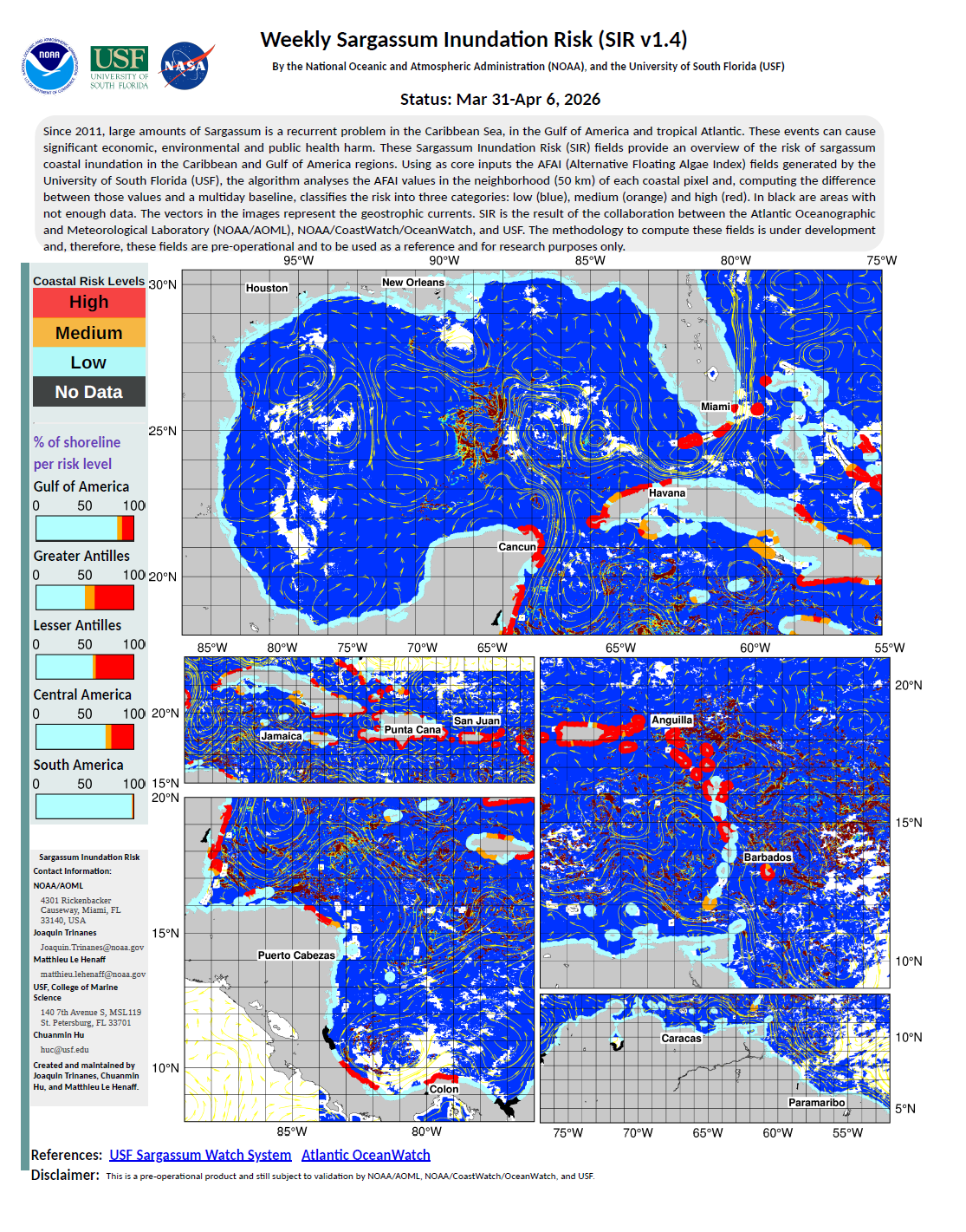 • Experimental Weekly Sargassum Inundation Risk (SIR v1.3) By the National Oceanic and Atmospheric Administration (NOAA), and the University of South Florida (USF) Status: March 31-April 6, 2026